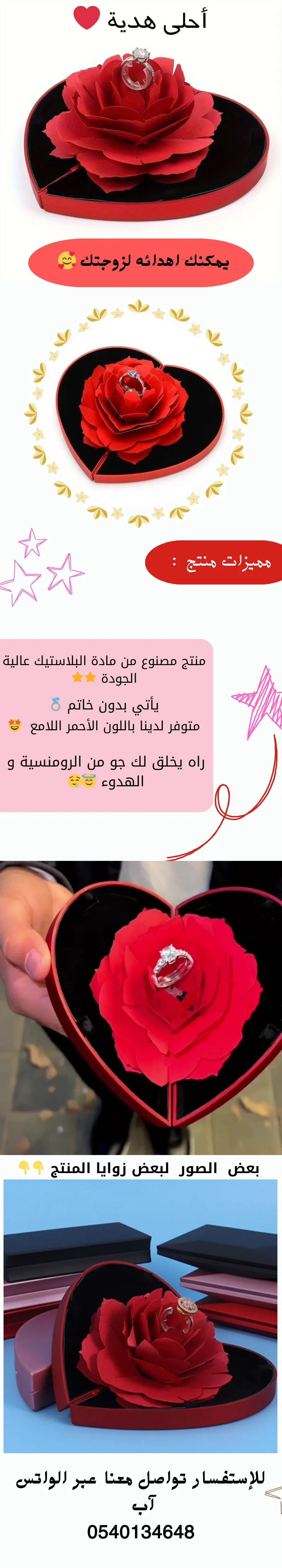 استمتع بتقديم هدية لا تُنسى مع علبة الخاتم الفاخر على شكل قلب مزينة بوردة حمراء. تصميم يجمع بين الرومانسية والأناقة ليكون الخيار المثالي في المناسبات الخاصة مثل عيد الحب، الأعياد، الخطوبة، والزواج.