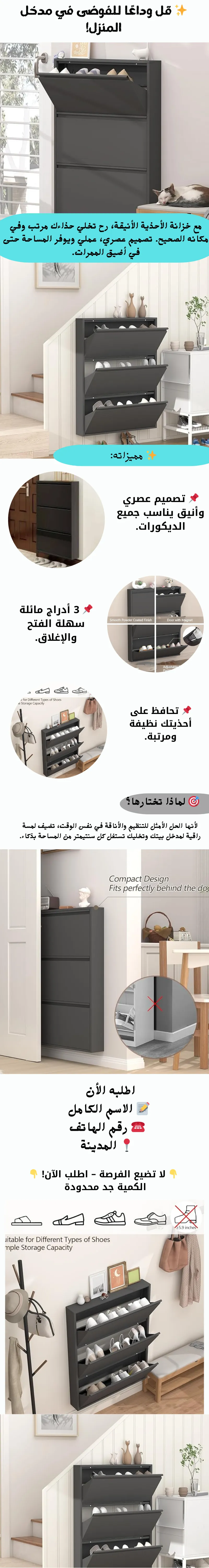 خزانة أحذية عملية بتصميم عصري وموفر للمساحة، تحتوي على عدة أدراج مائلة لتخزين الأحذية بشكل مرتب ونظيف. مثالية لوضعها عند مدخل المنزل أو في الممرات، تضيف لمسة أنيقة وتساعدك على تنظيم أحذيتك بسهولة.